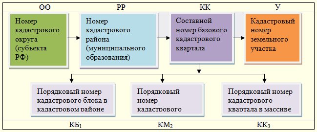 Присвоение земельным участкам кадастровые номера имеют четырехуровневую структуру ОО : РР : КК : У, где: